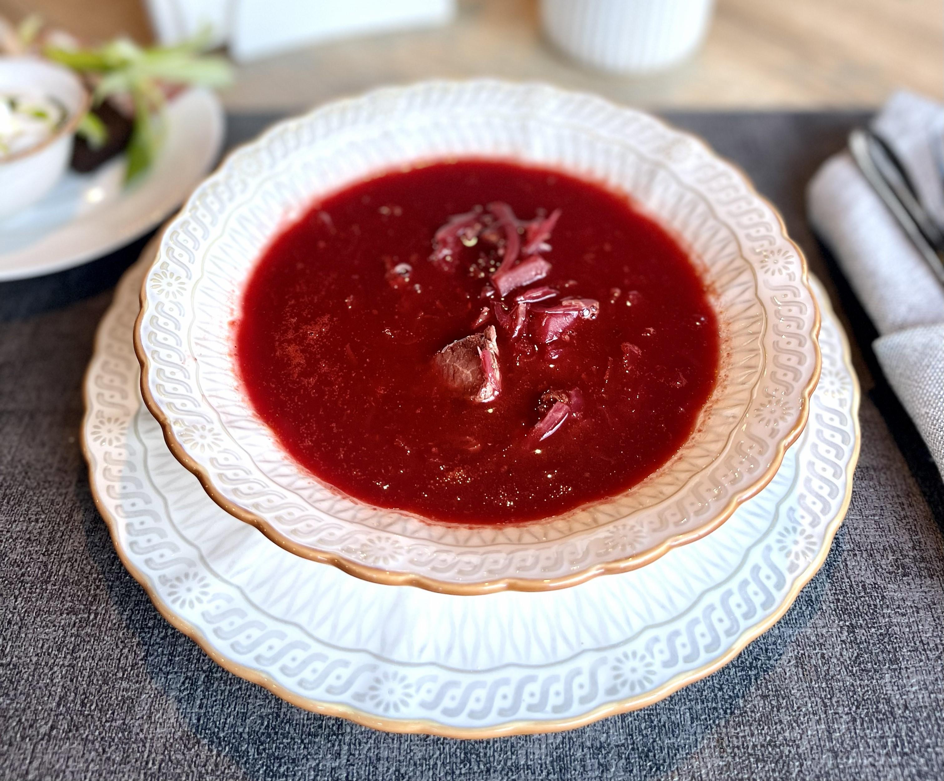 Говядина, капуста, картофель, лук, морковь, свекла, томатная паста, чеснок, сало