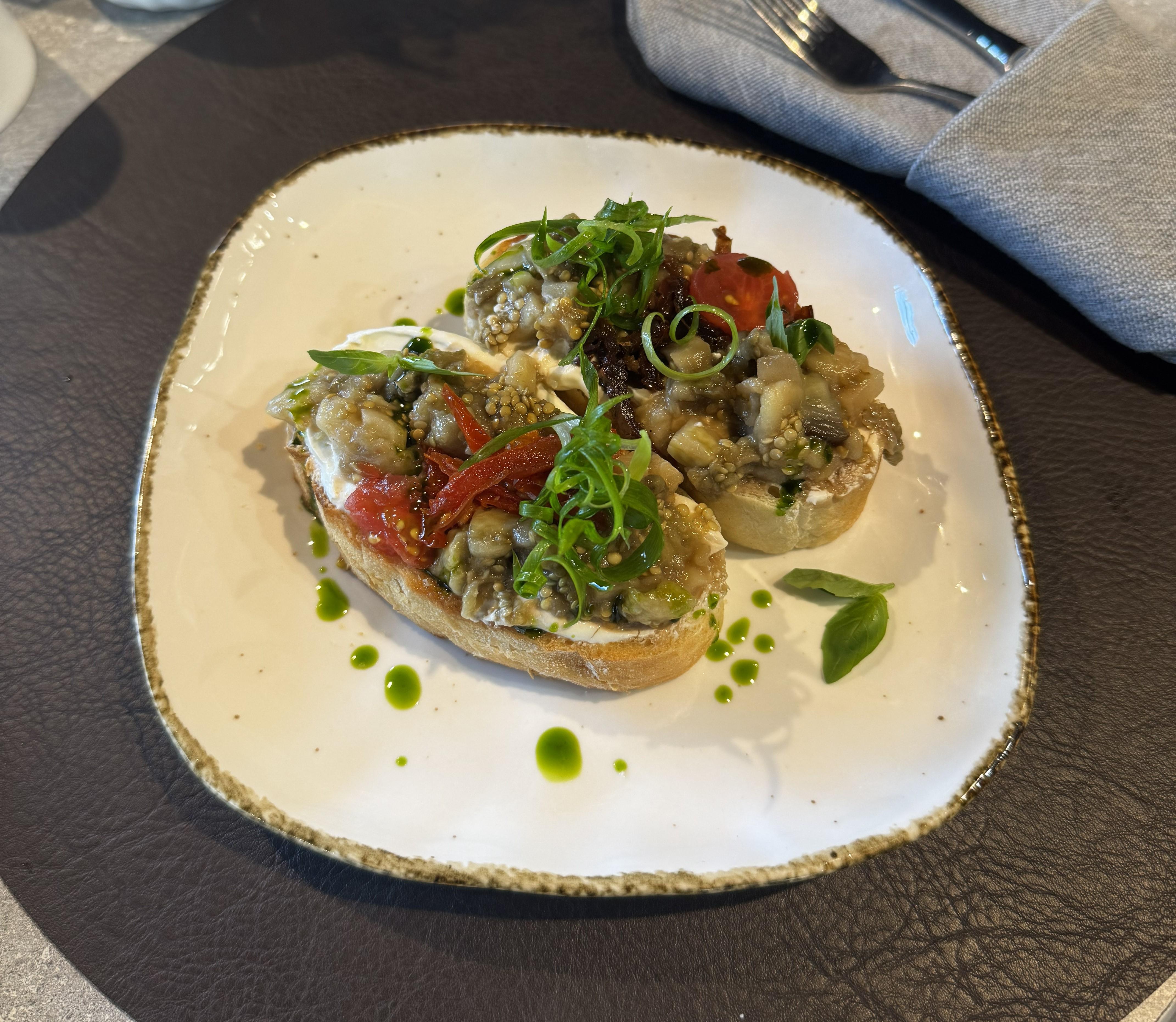 Брускетта с печенным баклажаном420 ₽Чиабатта, баклажан, вяленые томаты, крем из феты, песто, кинзаЗаказать