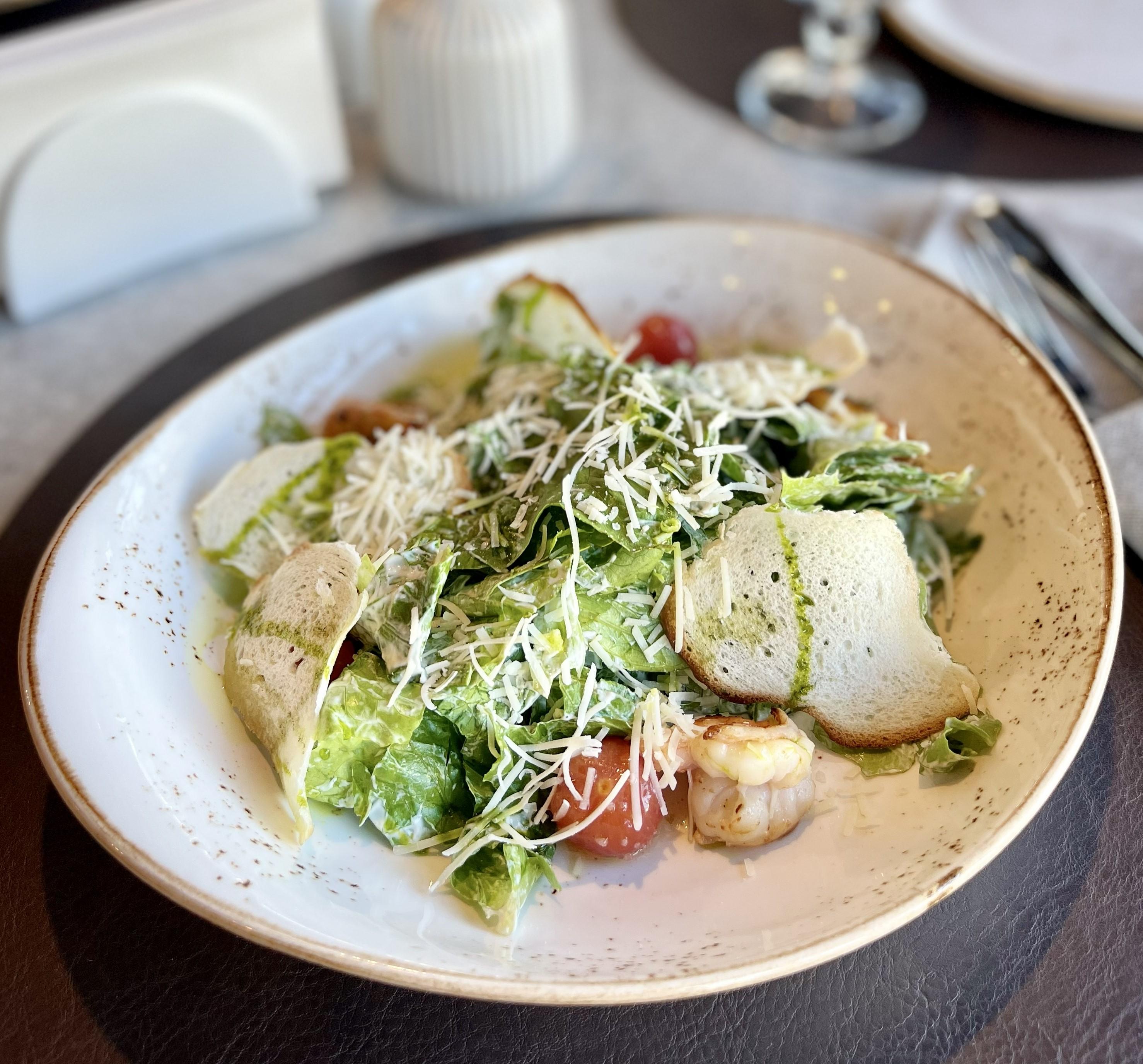 Салат романо, креветки, помидоры черри, тонкие гренки, сыр пармезан, домашний соус цезарь