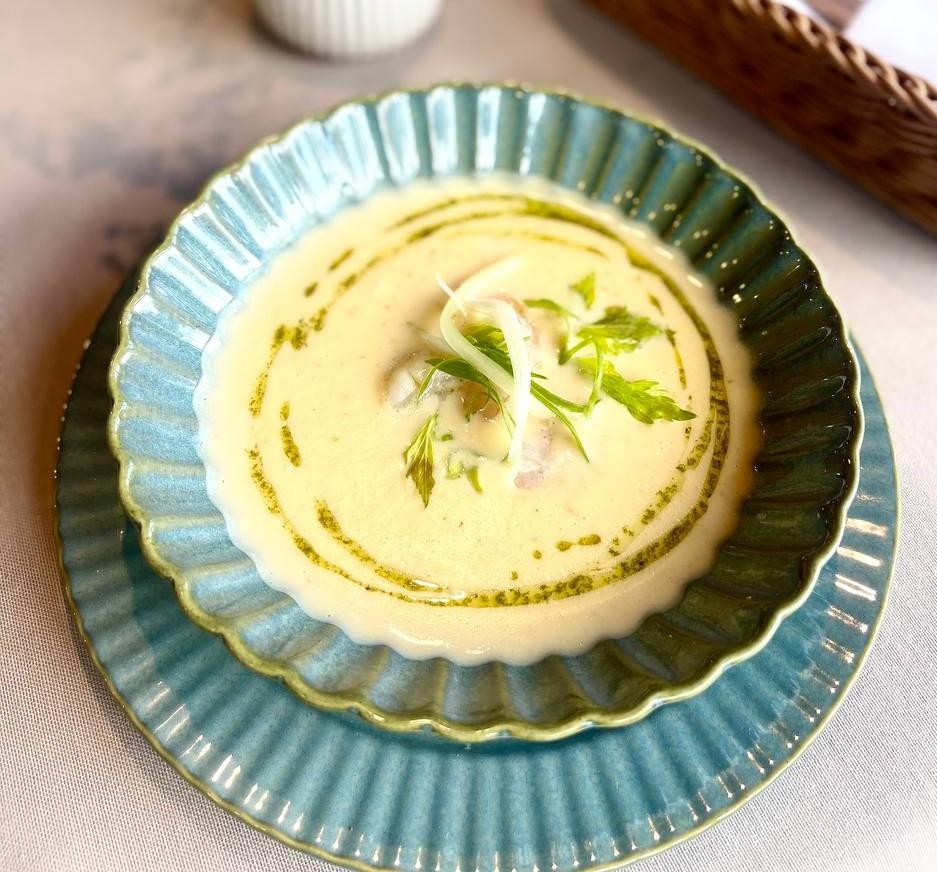 креветки, лосось, гребешки, бекон, картофель, сливки