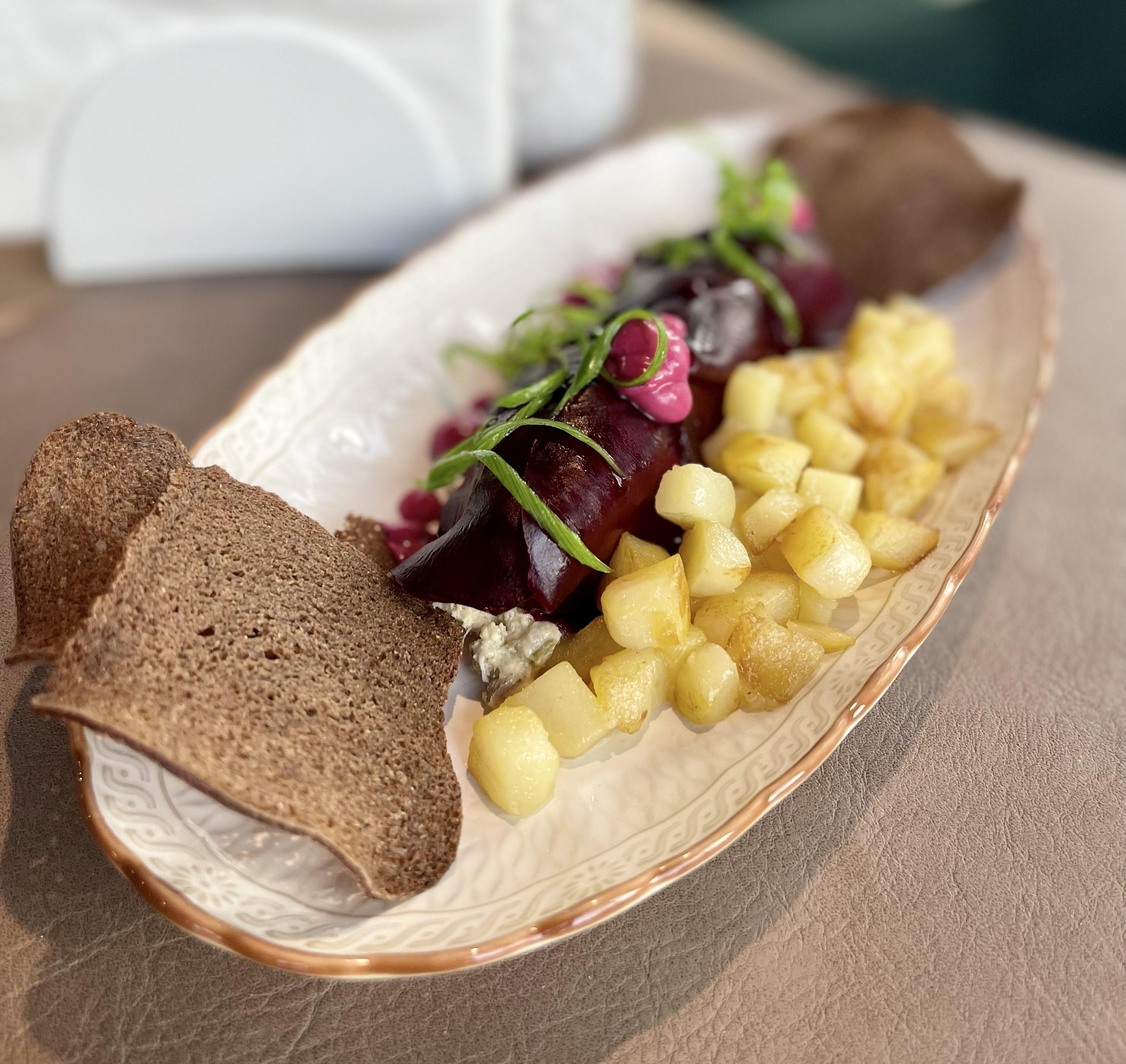 Скумбрия слабосоленая, картофель, свекла запеченная, яйцо, зеленый лук, яблоко, тонкие гренки