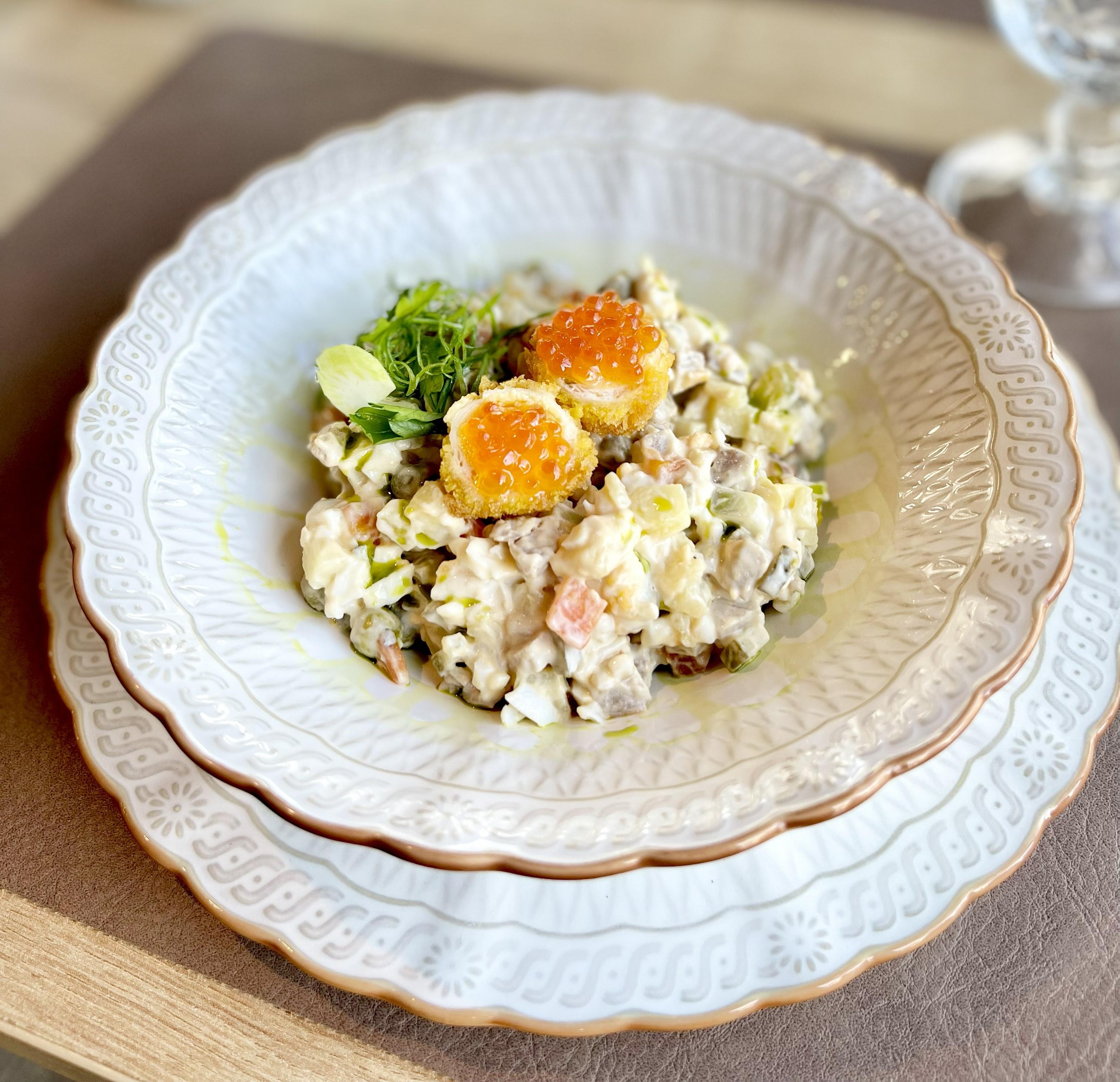 Буженина, картофель, морковь, яйца, соленые огурцы, горошек, лук, устричный майонез, икра лосося