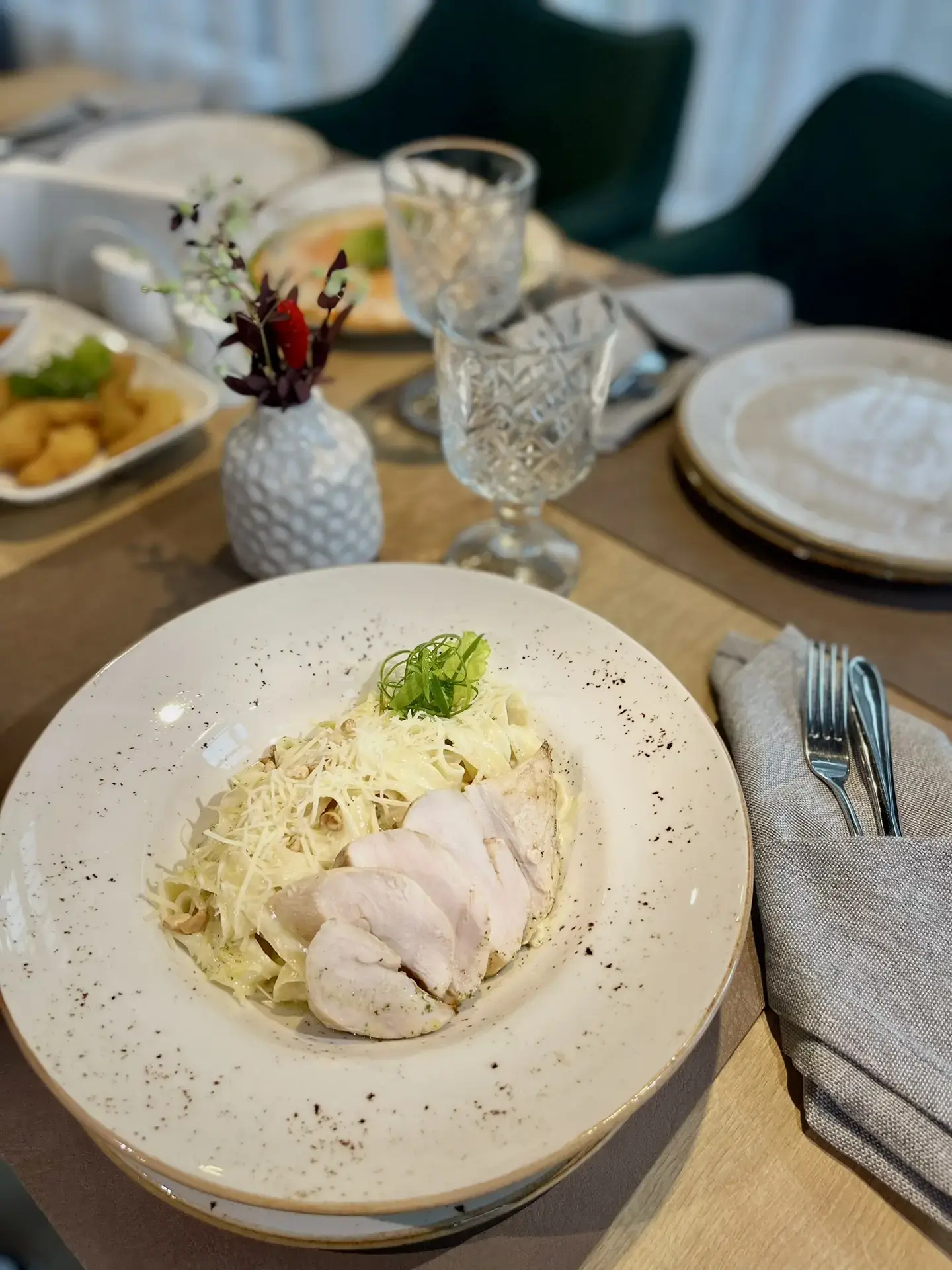Паста, куриное филе, пармезан, сливки, сливочное масло, кедровые орешки, пряные итальянские травы